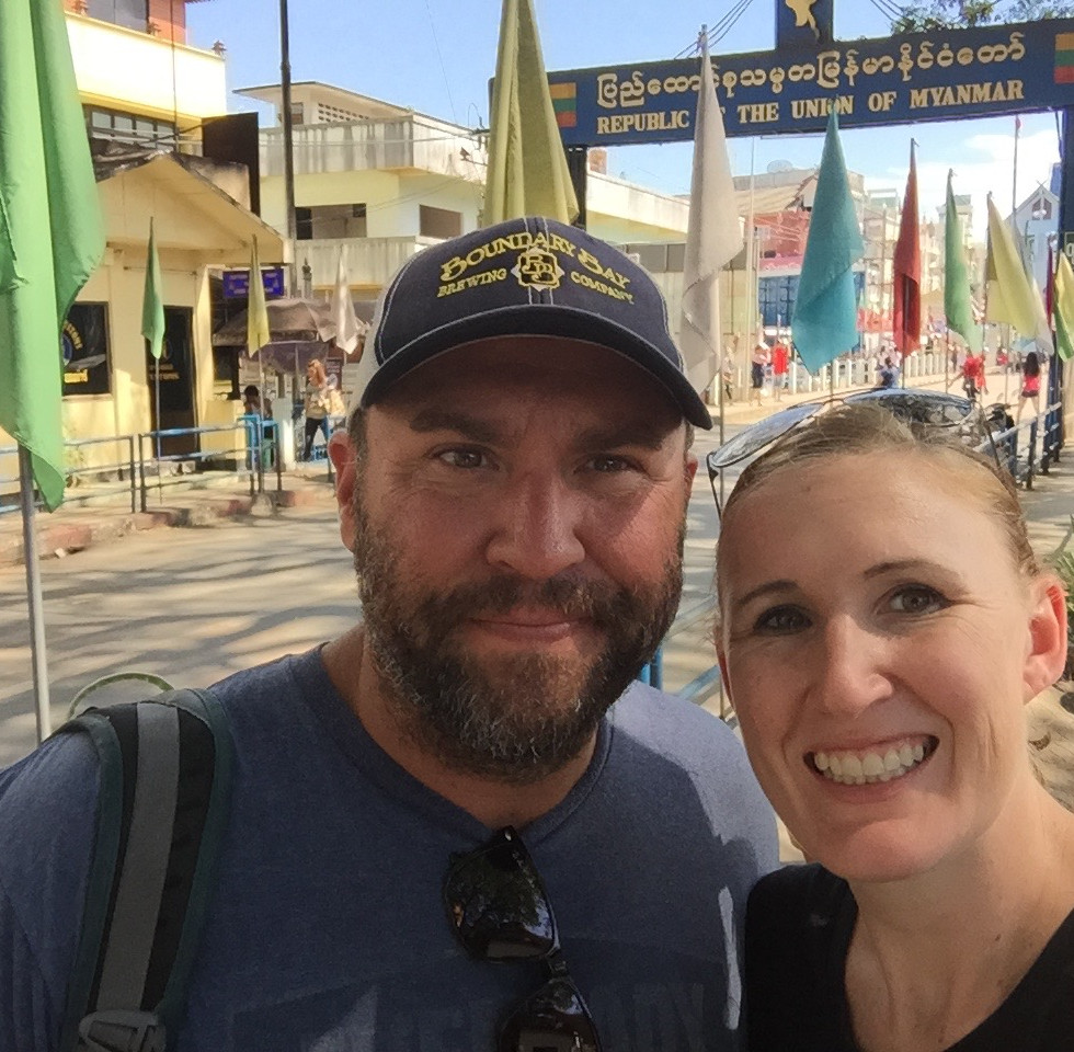 Well it finally happened…we had to wear helmets. I’m surprised we made it this long without doing something that required them! Our first morning in Chiang Rai we Deeter surprised me with a motorcycle ride to the Golden Triangle! Hmmm…good surprise or bad surprise??? Well it turned out to be really fun once I calmed down a little:) We drove along highway 1 to Mae Sai which is a border town between Myanmar and Thailand. We made the trip across the border to eat some delicious lunch…we don’t know what it was…the best communication at the restaurant entailed pointing, smiling, shaking our heads yes/no and thumbs up. So we ate some meat thing, with veggies, rice and a fried egg and some other delicious things they put in front of us and then walked around the border town and were sorely disappointed. Not sure what we expected of a border town, but we were hoping for something more exciting! We did eat some fresh roasted chestnuts that were delicious and I made a cute little friend to share them with!